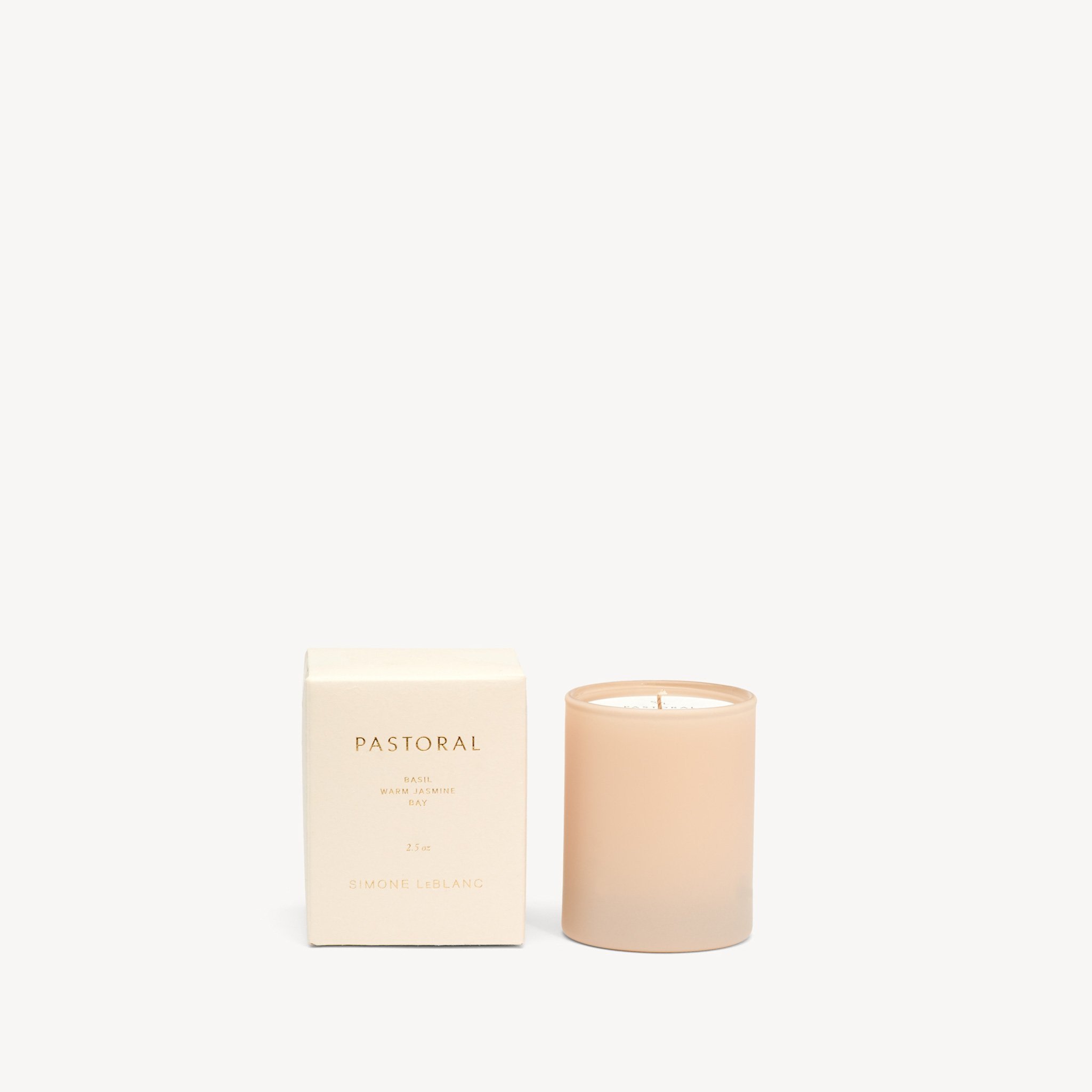 Simone LeBlanc Pastoral Votive Candle. This hand-poured, soy-wax candle has a light, refreshing scent of basil, jasmine and bay. It will become a favorite for every room. Burn Time: 15 hours
