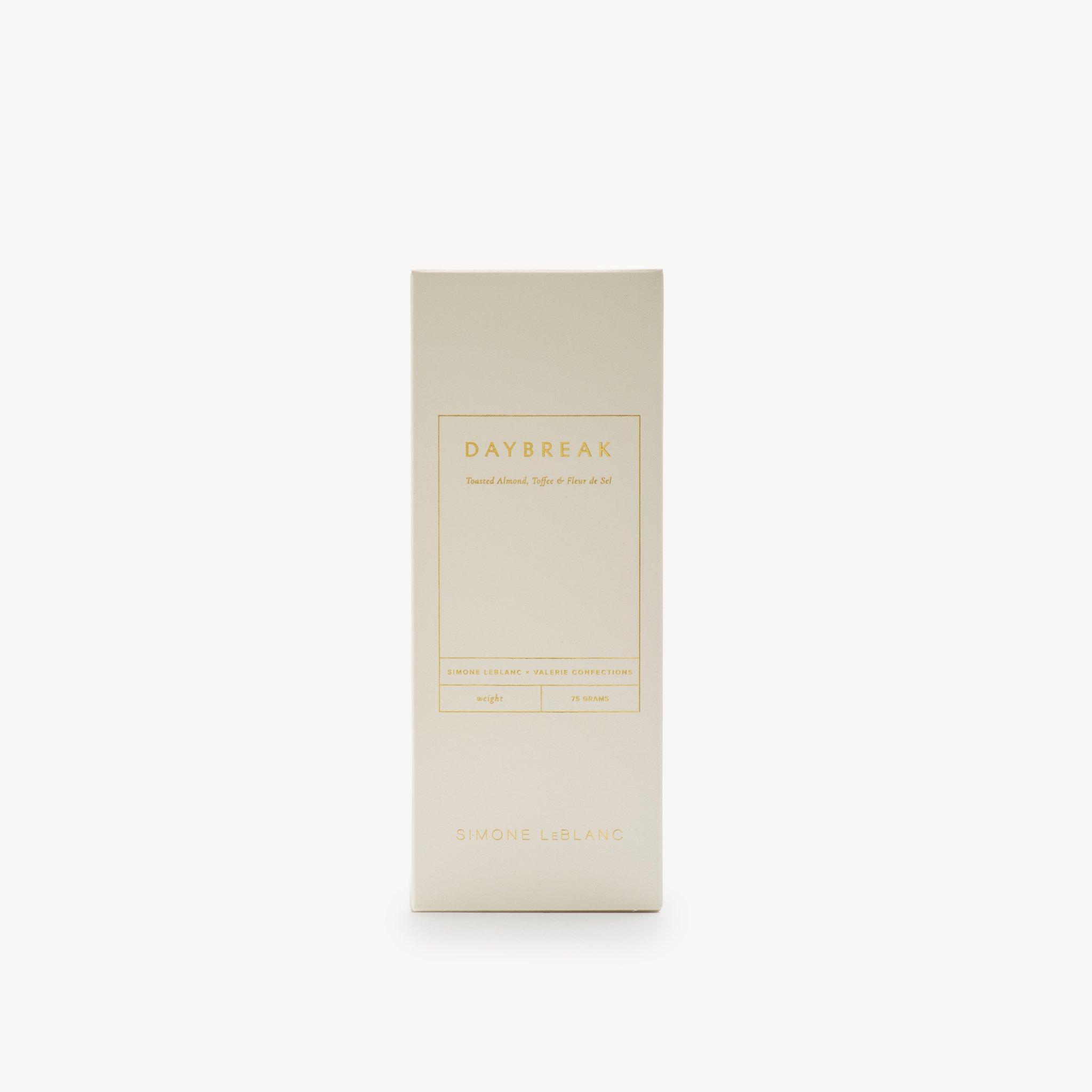 Daybreak Chocolate Bar by Simone LeBlanc x Valerie Confections. When night turns to day. Our dark chocolate bar created in collaboration with Valerie Confections studded with bits of her signature almond toffee, toasted almonds and fleur de sel. Packaged to match the exceptional quality of product, using minimal design to highlight the integrity of the ingredients.