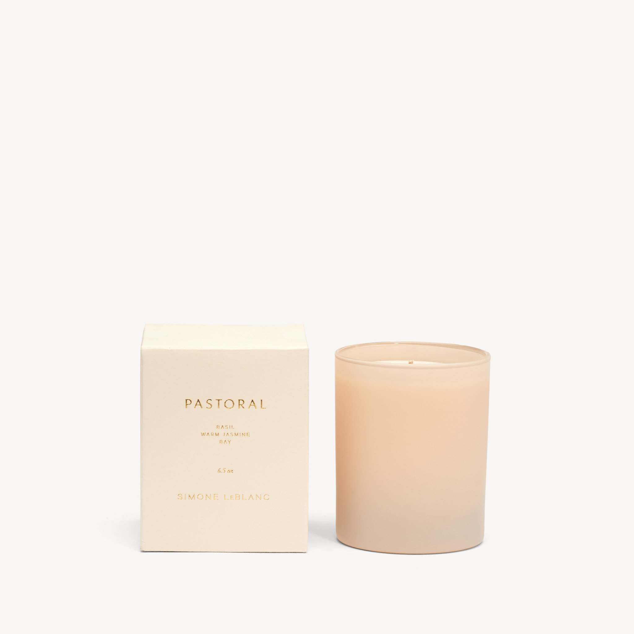 Simone LeBlanc Pastoral Candle. This hand-poured, soy-wax candle has a light, refreshing scent of basil, jasmine, and bay. Burn Time: 40 hours